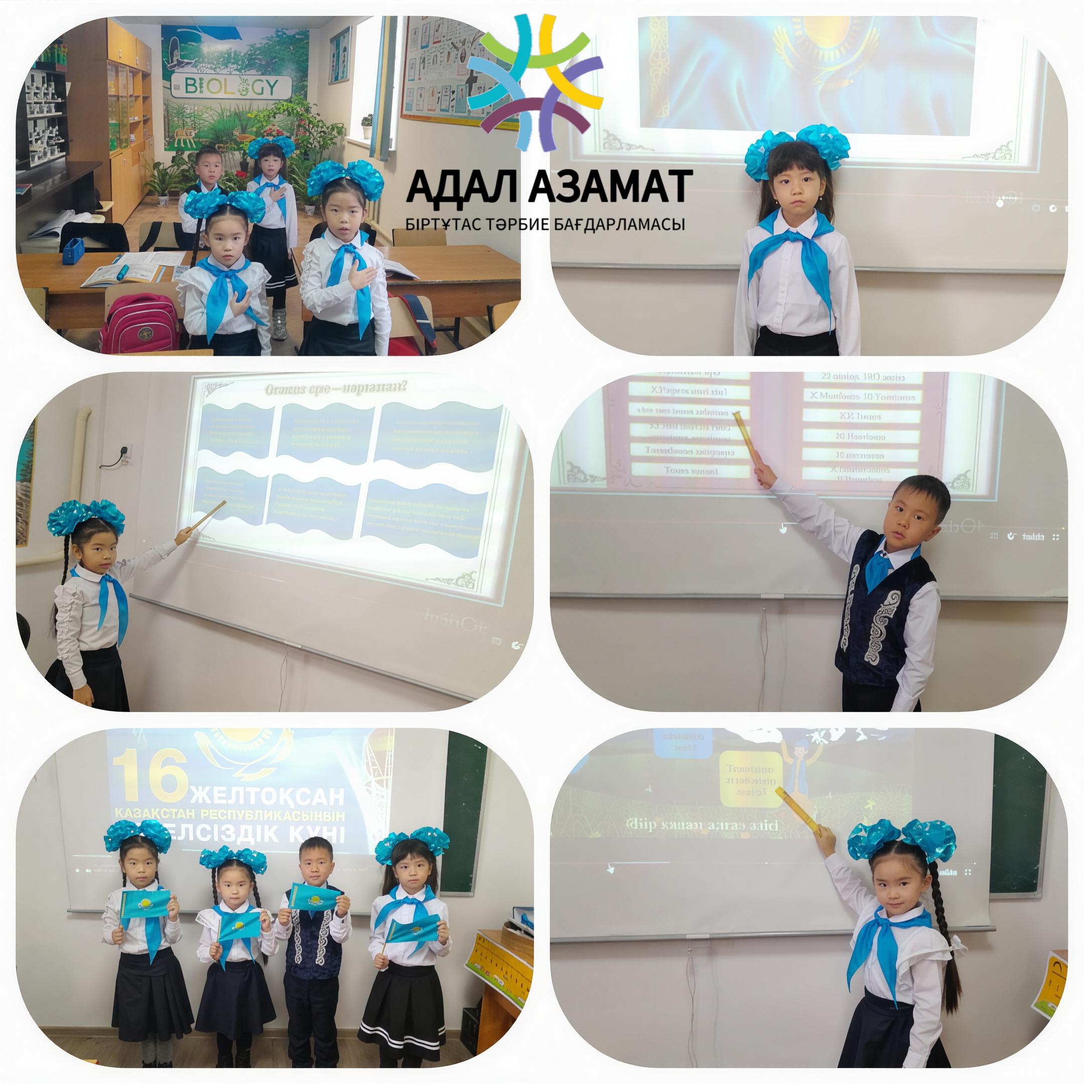 Абай облысы білім басқармасының Аягөз ауданы білім бөлімінің “№1 Ақшәулі жалпы орта білім беретін мектебі” КММ-де “Адал Азамат” Біртұтас тәрбие бағдарламасы аясында “Бірлік және ынтымақ айы” құндылығына негізделген 2025 жылдың 15 желтоқсан күні “16 желтоқсан - Қазақстан Республикасының Тәуелсіздігі күніне” орай, 1 сыныпта "Тәуелсіз Қазақстан қалыптастыру тарихы, "Ұлттық рәміздер - ел мақтанышы" атты сынып сағаты өткізілді.