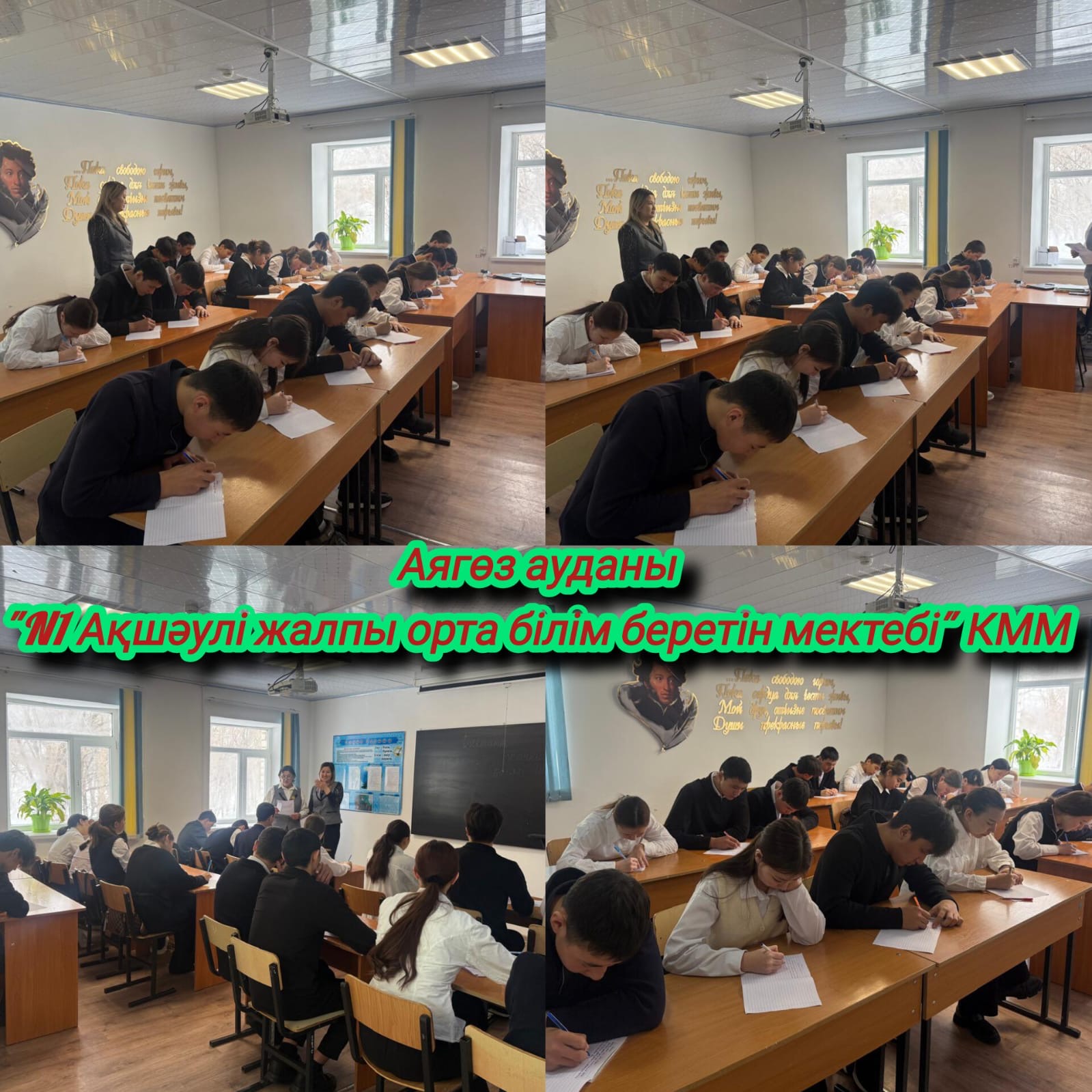 2026 жылғы наурыз айына арналған «Заң және Тәртіп» идеологиясымен ілгерілету жөніндегі облыстық іс-шаралар жоспарына сәйкес, 5 наурызда сағат 10:00-де 9-11 сынып оқушыларының арасында «Қылмыссыз ортаны құру - қоғам міндеті» тақырыбында бірыңғай диктант өткізілді.