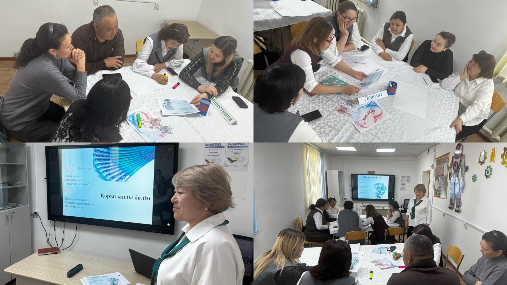 Тренинг барысында педагогтер “Депозит” және “Инвестиция” болып 2 топқа бөлінді. “Ақша мен үшін…” тақырыбындағы танысу жаттығуымен басталды. Қаржылық сауаттылық және инвестиция жайлы бейнероликтер көрсетілді. Практикалық топтық тапсырмалар орындалды. Мысалы: “Менің 1 айлық бюджетім” және “Қаржылық қателіктерді тап” тапсырмаларын орындады.