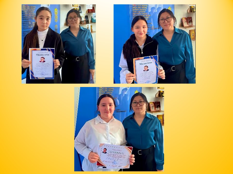 «Заманның заңғар тұлғасы бөліміне қатысқаны үшін 8 сынып оқушысы Аманғазы Айзере І орын;