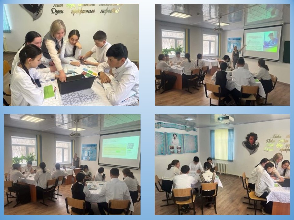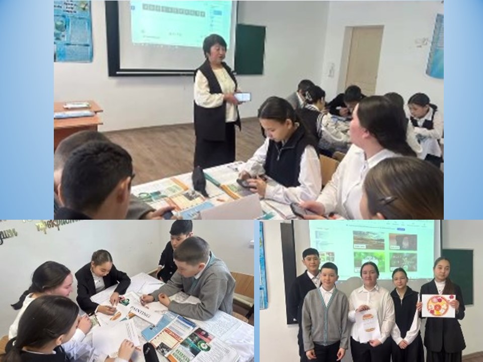 Сабақтар барысында ЖИ-мен жасалған бейнероликтер, презентациялар көрсетілді. Оқушылар ЖИ-мен жасалған әртүрлі жеке, жұптық, топтық, функционалды сауаттылық тапсырмаларын орындады.